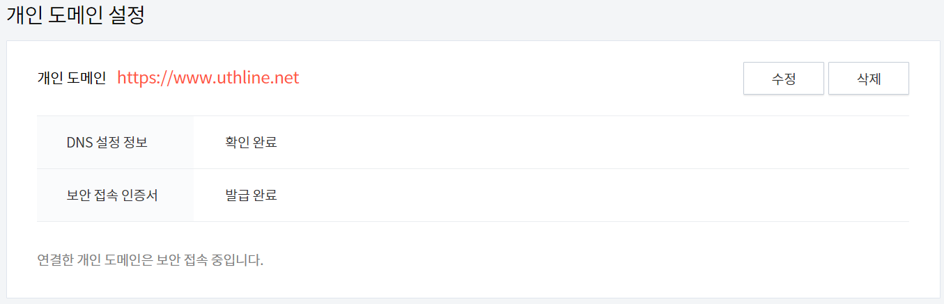 우선, 티스토리 설정에서 "블로그설정" > "관리" > "블로그" > "개인 도메인 설정"을 변경해보았다. 원래 여기에 www이 안 붙은 상태로 설정이 되어있어서, www를 붙이도록 수정을 한것 이다. 그랬더니, 이번엔 www를 붙이면 정상적으로 접속이 되고, www를 안붙이면 위 에러 페이지로 연결이 되었다. "음... 이문제가 아니군!!"